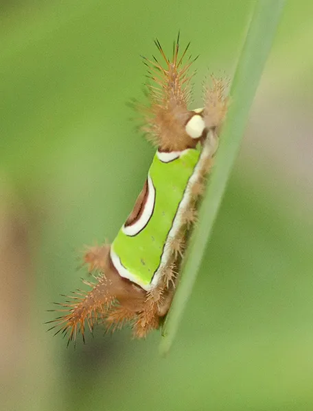 It was a saddleback caterpillar, unmistakably so. Its body was a bright, almost neon green, contrasted sharply by a brown, saddle-like marking bordered in creamy white.